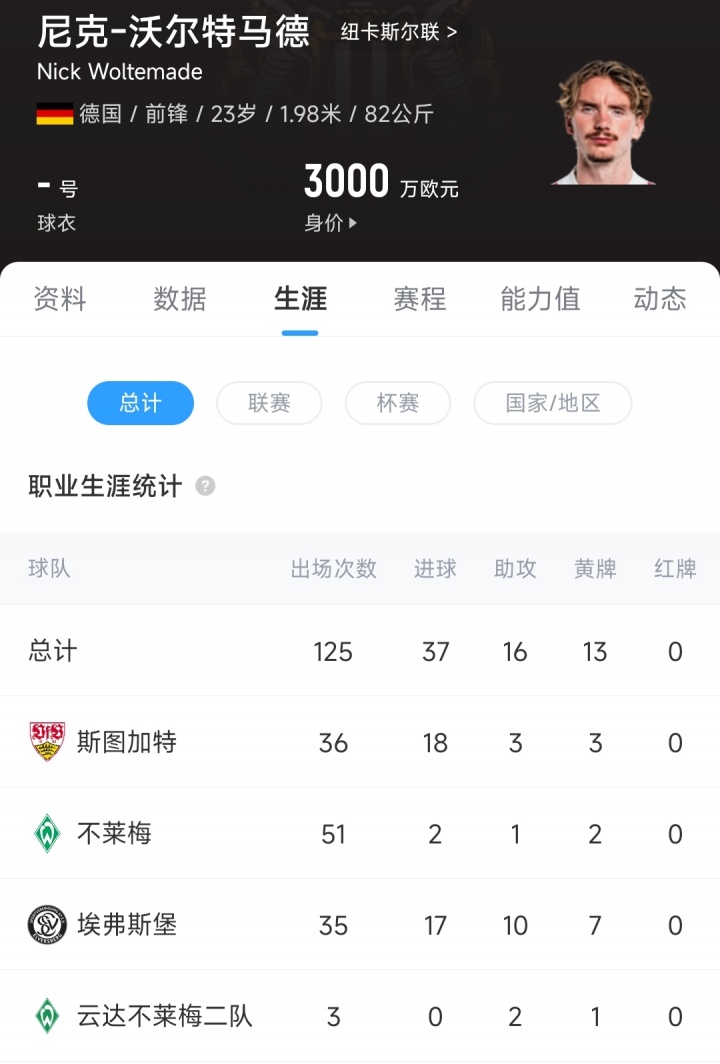 08月30日讯 官方音书,纽卡斯尔从斯图加特签下23岁的沃尔特马德,德转数据透露,沃尔特马德的转会费为8500万欧元。
