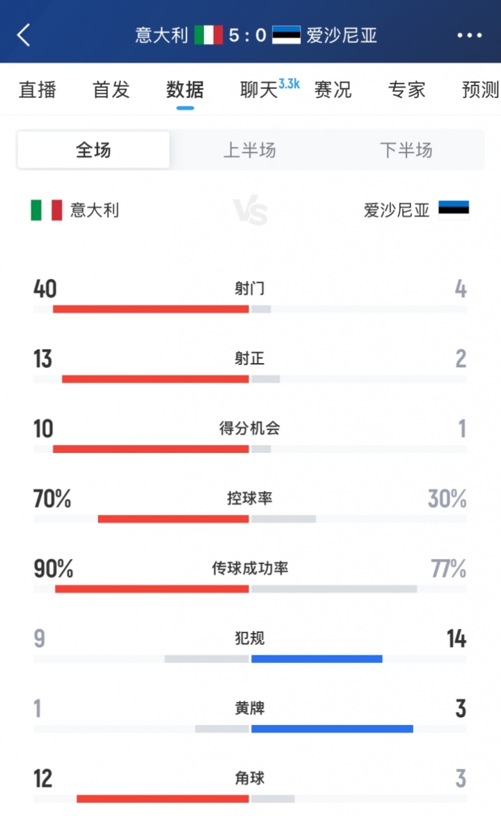 紧迫方面,意大利射门数40-4,射正数13-2,得分契机意大利达到10次。控球方面,意大利达到70%。