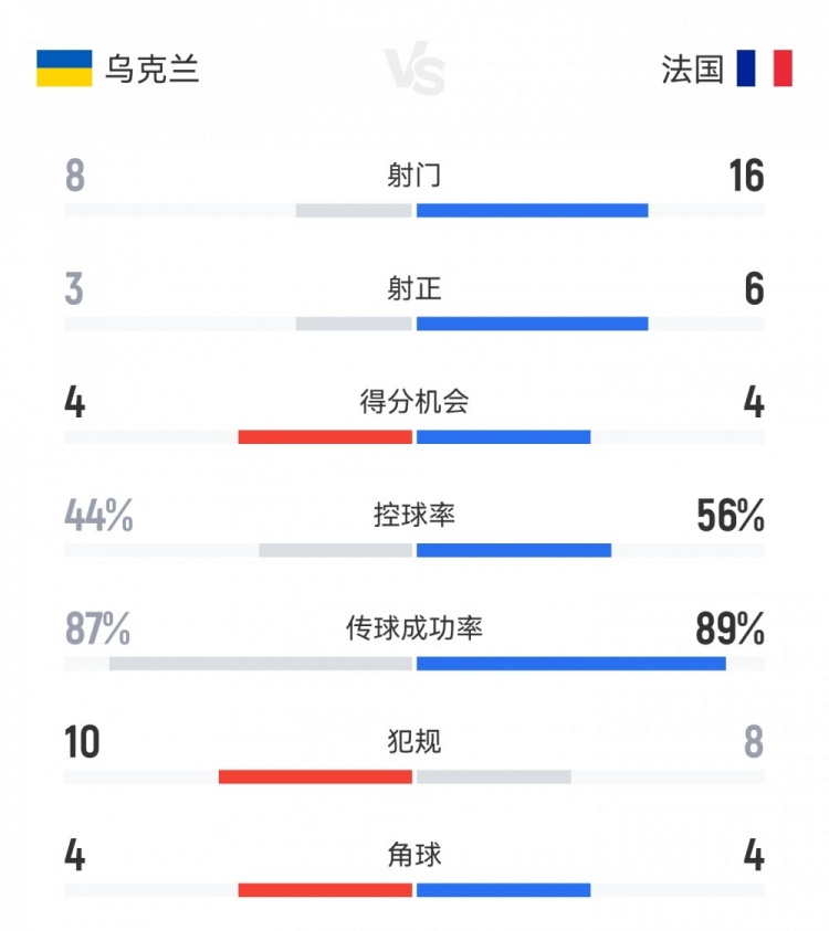 9月6日讯 世初赛,法国2-0客胜乌克兰。两边全场要点数据对比如下↓(主队乌克兰在前)