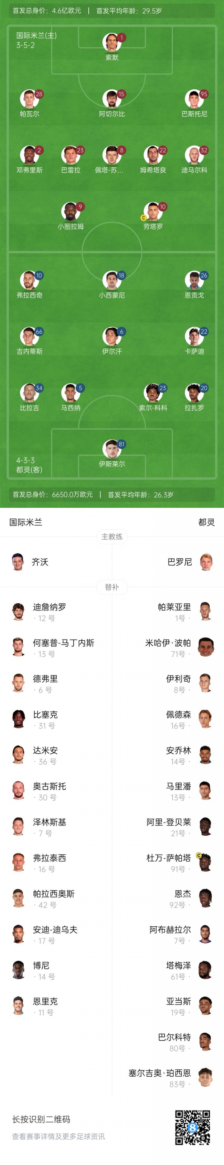 国米首发:1-索默、28-帕瓦尔、15-阿切尔比、95-巴斯托尼、2-邓弗里斯、8-苏西奇、23-巴雷拉、22-姆希塔良、32-迪马尔科、10-劳塔罗、9-图拉姆
