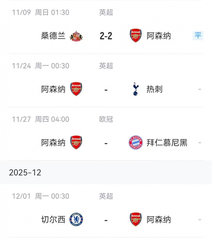 本场比赛战平后,阿森纳曩昔的赛程也劲敌环伺。下轮联赛,他们将在主场迎战热刺,演出“北伦敦德比”,随后在欧冠中迎战拜仁。