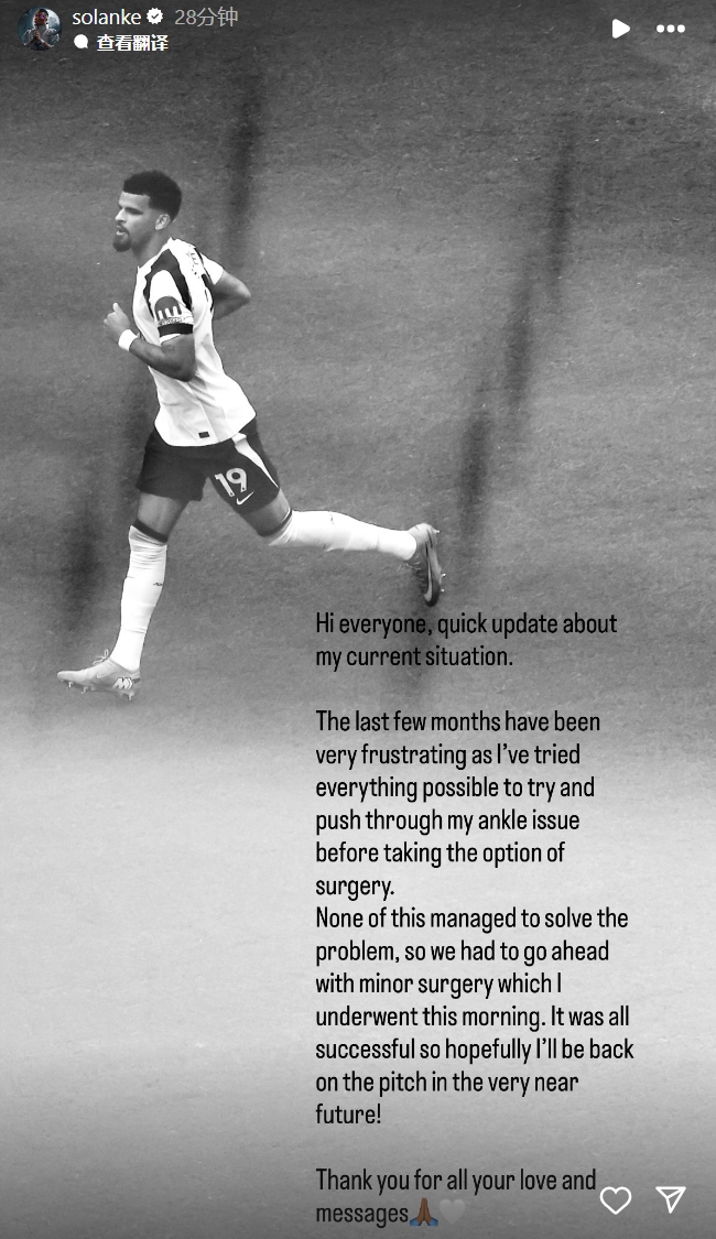 索兰克:“宇宙好,给宇宙快速更新一下我当今的情况。往日的几个月相等令东说念主颓丧,因为我尝试了总共可能的主义来料理我的脚踝问题,但齐莫得得胜,是以今天早上我不得不罗致了小手术。手术很得胜,但愿很快就能回到球场上!感谢宇宙的关注和维持。”