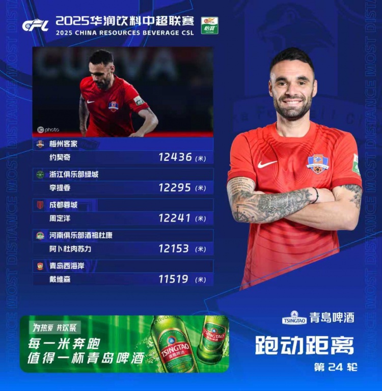 排在本轮跑动榜第5位的,是青岛西海岸外助戴维森,他的跑动距离为11519米。值得一提的是,戴维森亦然本轮跑动榜前5位中独逐个名挫折型球员。