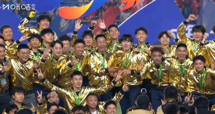 赛后受奖门径,泰州队全队身着金色战袍,捧出手届苏超冠军奖杯!