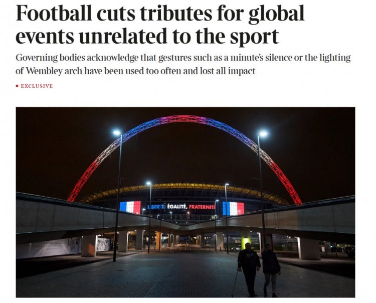 英足总、英超联赛和英格兰足球联赛竖立了“宇宙事件使命组”(WEWG),以带领英格兰足球对首要宇宙事件的反应。除非事件与足球有径直关联,不然联赛将不会举行致哀庆典,也不会点亮温布利球场的拱门。