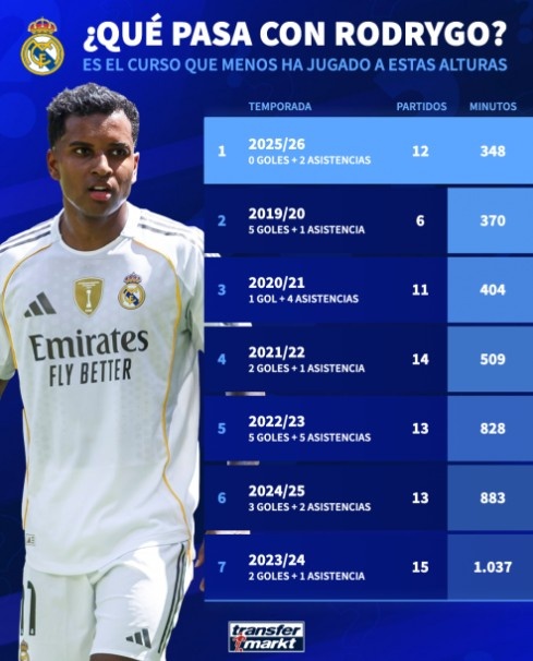 11月8日讯 尽管皇马主帅阿隆索屡次在新闻发布会上强调罗德里戈是球队阵中要紧一员,但数据却涌现了皆备不同的情况。在蹙迫端,唯有恩德里克和贡萨洛-加西亚比他出场本领更少。事实上,这是他加盟皇马以来前15场比赛出场本领最少的一个赛季。