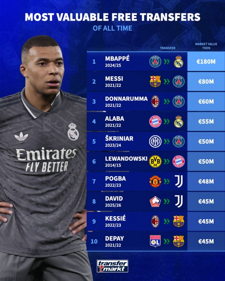 11月29日讯 德国转会商场列出了摆脱转会球员身价排行,姆巴佩1.8亿欧居首,梅西8000万欧次席。