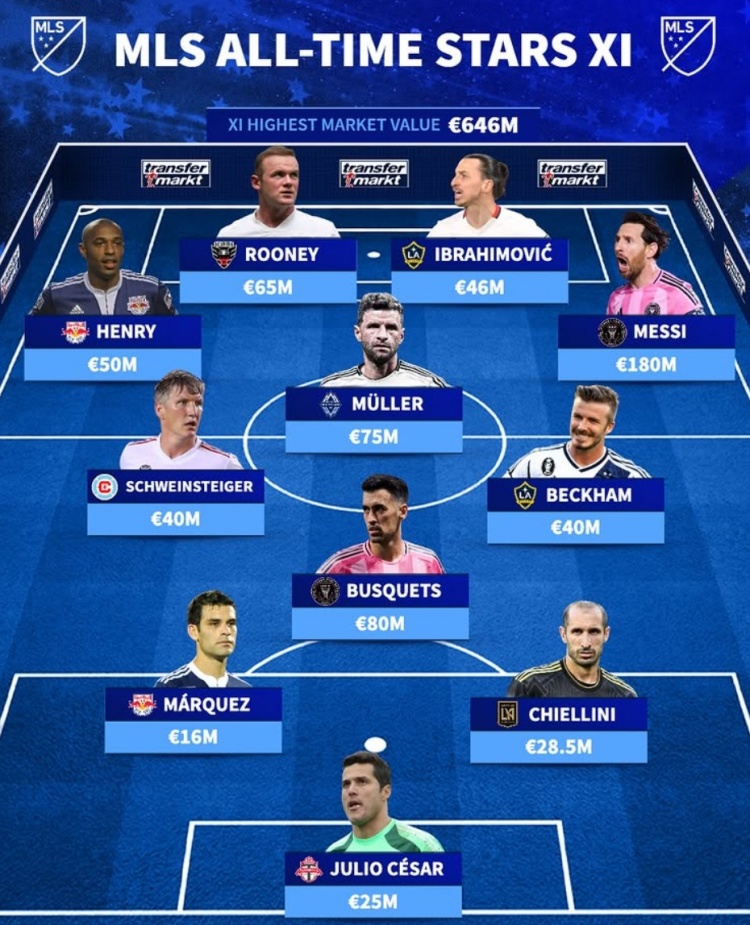前卫:蒂埃里·亨利(纽约红牛,5000万)、韦恩·鲁尼(华盛顿特区联,6500万)、兹拉坦·伊布拉希莫维奇(洛杉矶星河,4600万)、梅西(迈阿密国外,1.8亿)