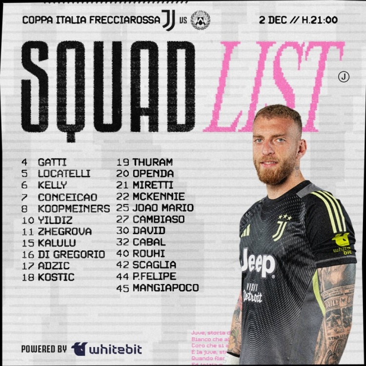 12月2日讯 北京时分未来凌晨4点,尤文将看强大利杯1/8决赛中对阵乌迪内斯,尤文公布了此役的球员名单。佩林、弗拉霍维奇缺席。