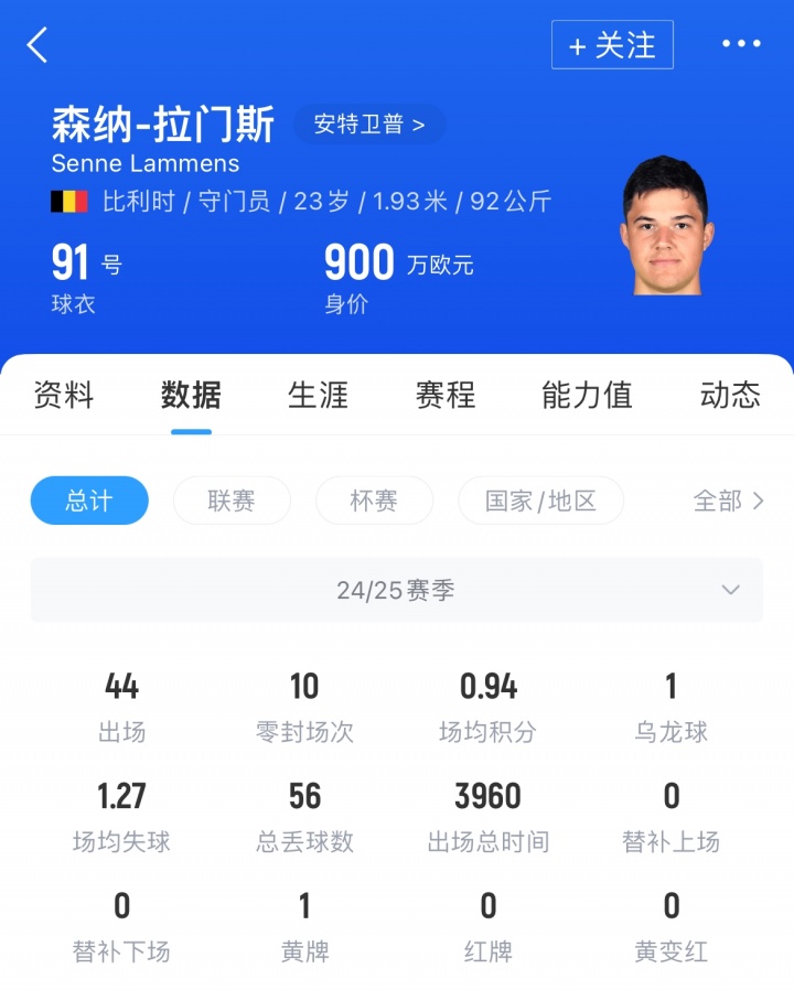 拉门斯时年23岁,比利时籍门将。上赛季他为比甲安特卫普出战44场,赢得10场零封,场均失球1.27个。当今其德回身价为900万。