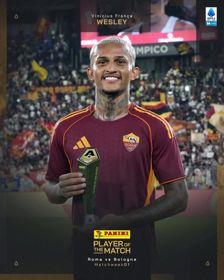 8月24日讯 意甲官方通知,韦斯利当选罗马1-0博洛尼亚全场最好球员。
