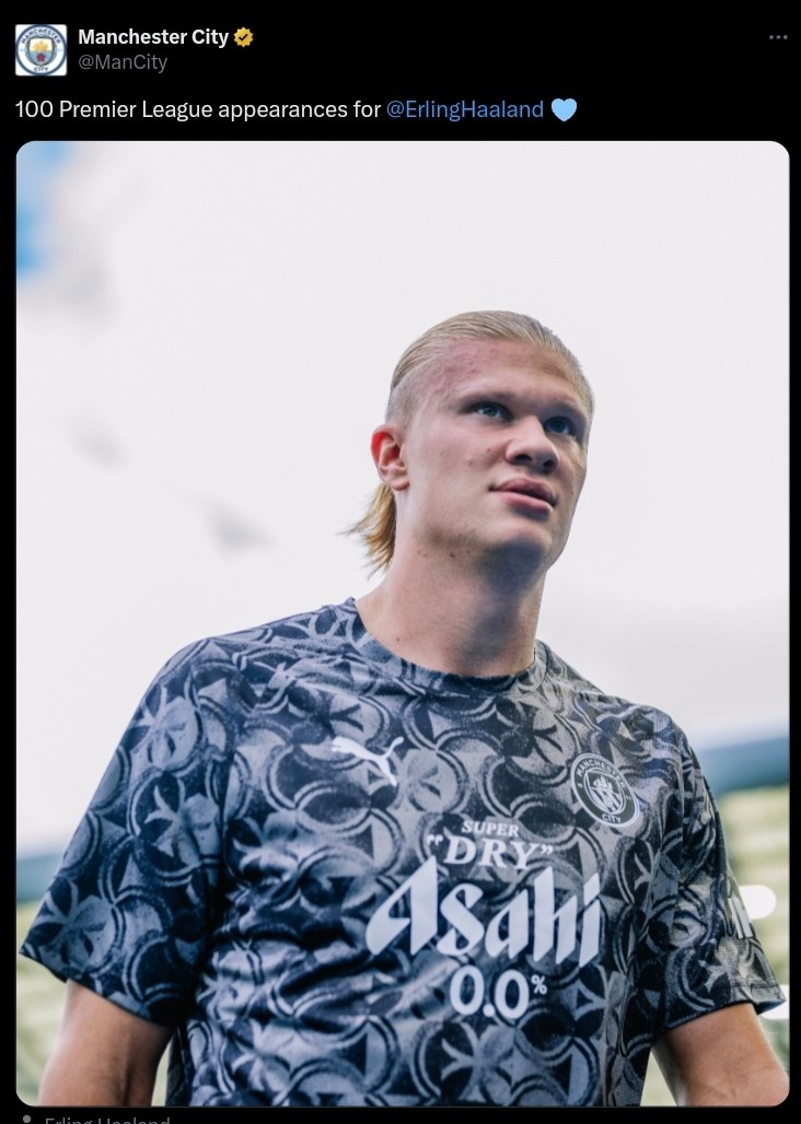 本场比赛亦然哈兰德生存第100次代表曼城在英超出场,此前的比赛他为球队孝顺87球17助攻,曼城官推也晒照为其顾忌。