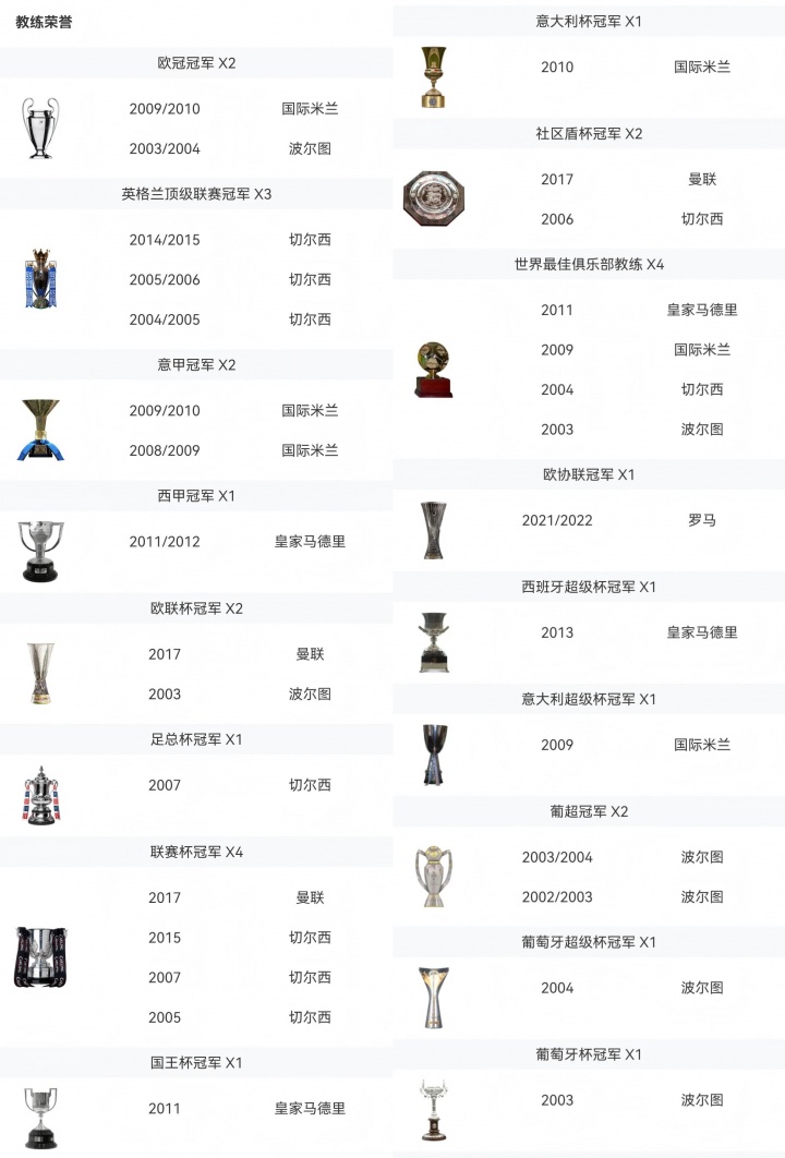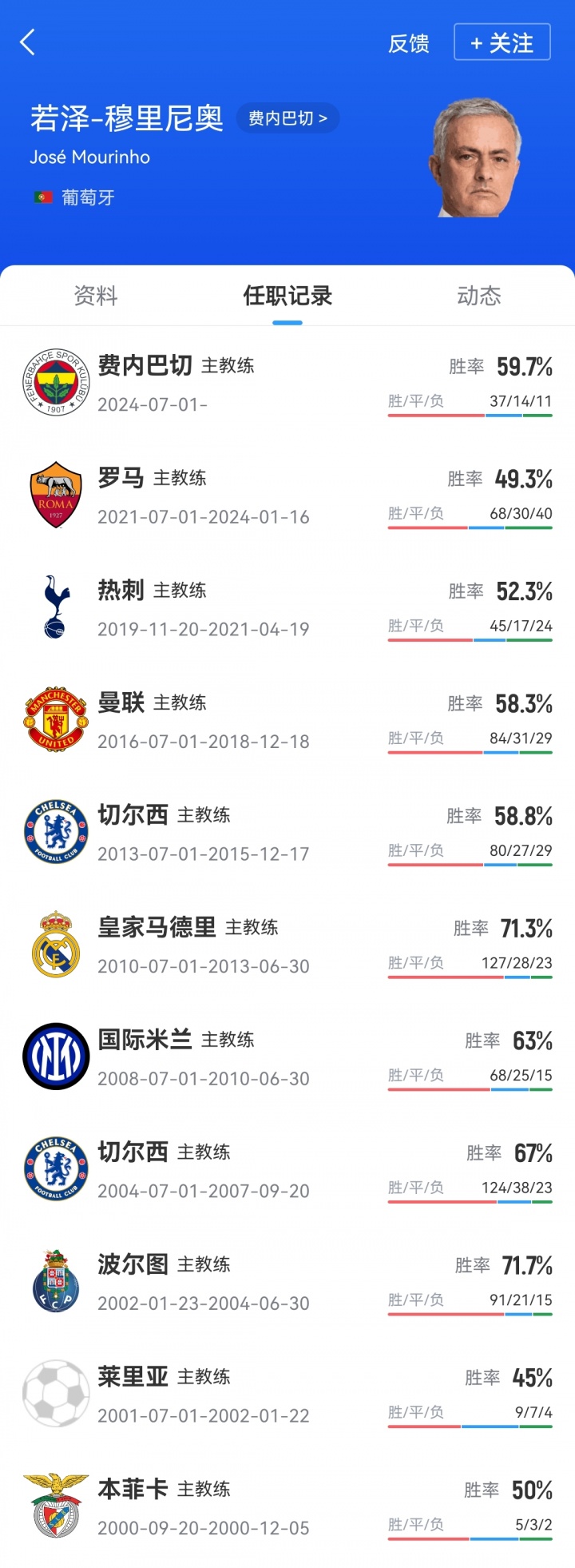 穆里尼奥现年62岁,抓教生存从葡萄牙体育起步,历任本菲卡、莱里亚、波尔图、切尔西、国米、皇马、切尔西、曼联、热刺、罗马和费内巴切主帅,他的下一站是哪儿?