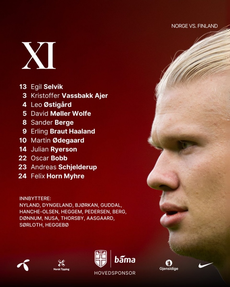 挪威首发:13-塞尔维克、3-阿耶尔、4-厄斯蒂高、5-戴维-沃尔费、8-桑德-博格、9-哈兰德、10-厄德高、14-莱尔森、22-奥斯卡-鲍勃、23-施耶尔德鲁普、24-米赫埃