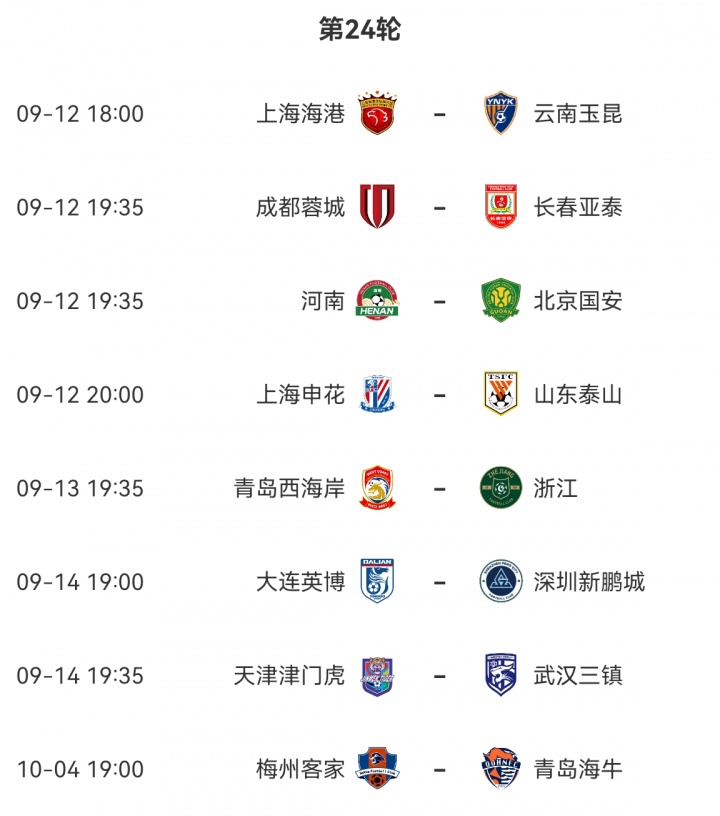 09月12日讯 中超重燃战火,前4球队今天纷纷出战,蓉城对阵倒数第一但近来现象不俗的亚泰,近5轮只拿到1胜的申花大战4连胜的泰山,海港主场迎战客场战绩厄运的玉昆,国安客场挑战河南。