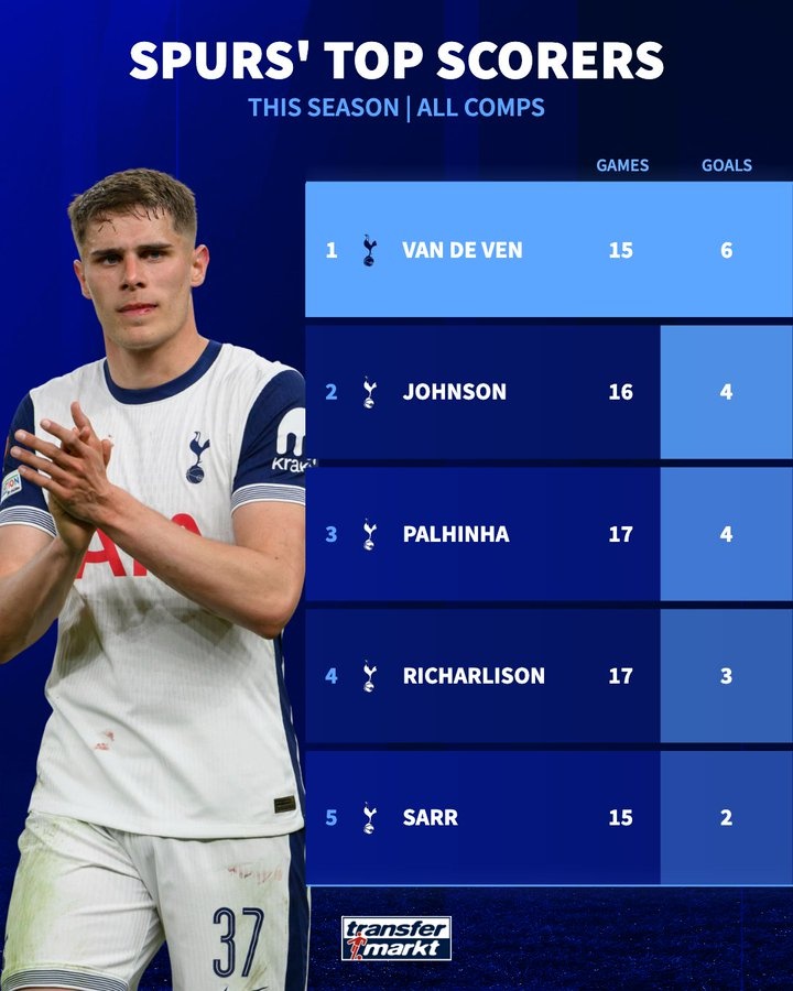 德国转会阛阓统计了本赛季热刺队内球员的进球数目,并排出榜单,中卫范德芬6球居首。
