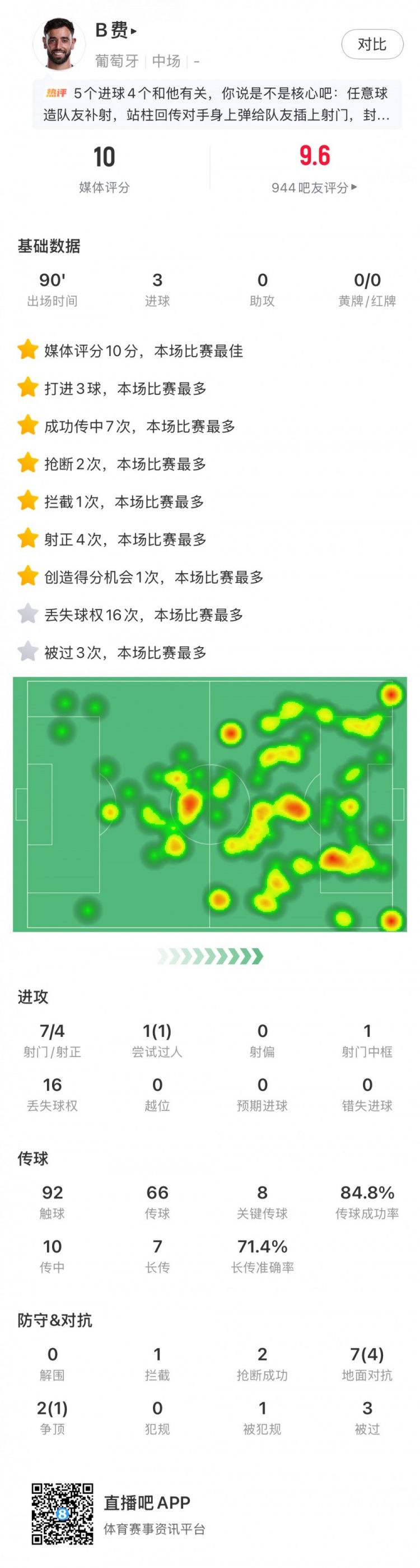 11月16日讯 世初赛欧洲区小组赛F组第6轮,葡萄牙镇守巨龙球场9-1狂胜亚好意思尼亚,小组头名纵贯好意思加墨全国杯。本场比赛B费孝敬完整领略,演出帽子戏法,赛后得到10分的满分评分。